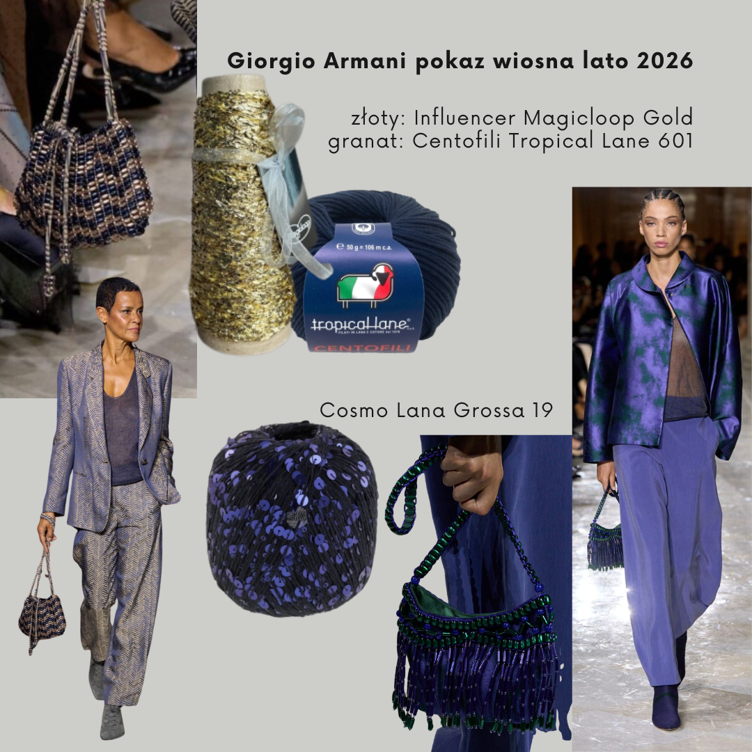 Podczas Milan Fashion Week mogliśmy obejrzeć przepiękne i inspirujące pokazy, które zawsze nasuwają nowe pomysły na dziergane torebki. Klasyczne dziergane torebki typu oreo albo tulipan – warto mieć, ale są one bardzo powszechne wśród dziewiarek. Szukając czegoś bardzo świeżego i oryginalnego – musimy zajrzeć do Giorgio Armaniego, który stanowi hołd wobec wielkiego projektanta, podsumowując jego filozofię tworzenia.