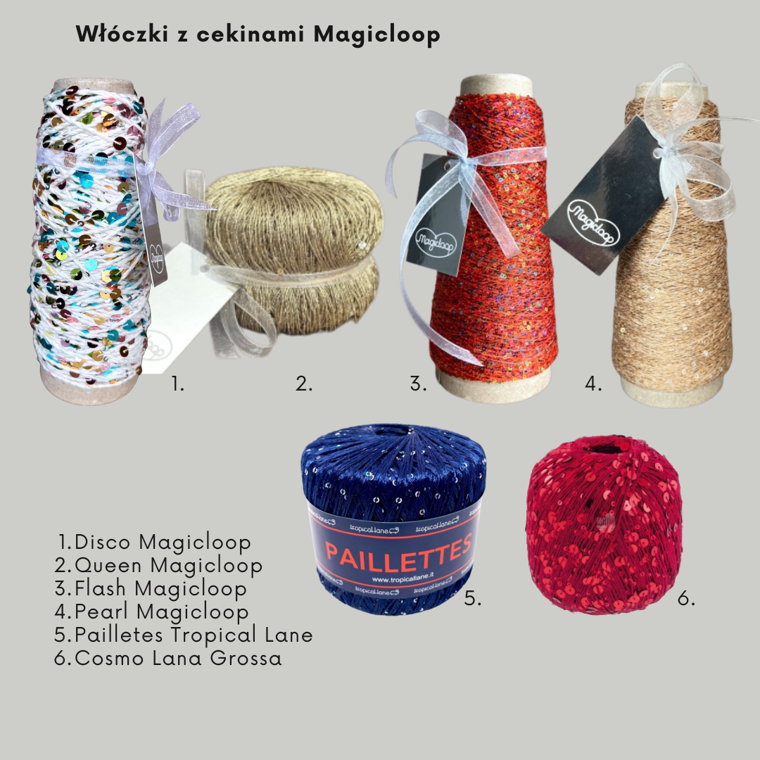 Jeśli drapie nas konkretne włókno, które jest rdzeniem włóczki cekinowej – nie ma się co czarować, że przestanie nas drapać. Szczególnie jest to ważne kiedy dziergamy na wrażliwsze części skóry – dla części osób będzie to czoło, dla innych dekolt, dla innych nadgarstki. Na szczęście w Magicloop pomyśleliśmy o tym i mamy włóczki z cekinami o różnym składzie rdzenia, dzięki czemu każda, nawet najwrażliwsza osoba znajdzie przyjemne dla swojej skóry włókno. Disco Magicloop i Cosmo Lana Grossa zawierają cekiny na bawełnianej nitce, która nie drapie nikogo. Bardzo gładkim włóknem jest nylon, z którego produkuje się między innymi delikatne rajstopy i we włóczce Flash Magicloop cekiny są na gładkim i elastycznym nylonie (poliamidzie) właśnie. Mamy też włóczki gdzie cekiny są na wiskozie: Venera Stenli oraz Queen Magicloop, z zastrzeżeniem że Queen zawiera dodatkowo włókno metalizowane, które dodaje jeszcze więcej blasku ale nie każda skóra je akceptuje. Pearl Magicloop z kolei to połączenie dla najbardziej wymagających: len z jedwabiem!