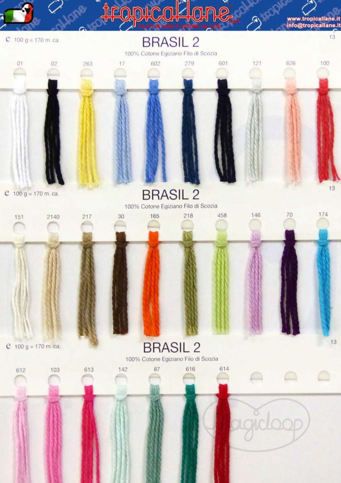 Brasil2 to znakomita bawełna egipska o charakterystycznym, przyjemnym chwycie i doskonałej jakości. Egipska bawełna charakteryzuje się wysoką wytrzymałością przy zachowaniu świetnego wyglądu włókna w dzianinie. Brasil2 sprawdza się zarówno w projektach letnich: w dzierganych bluzkach i sukienkach, ale będzie też idealna dla swetrów na druty lub szydełka 4-5mm. Bawełna w dzianinach mocno trzyma strukturę i nie rozciąga się co jest jej największą zaletą. Do tego jest włóknem oddychającym i odprowadzającym wilgoć.