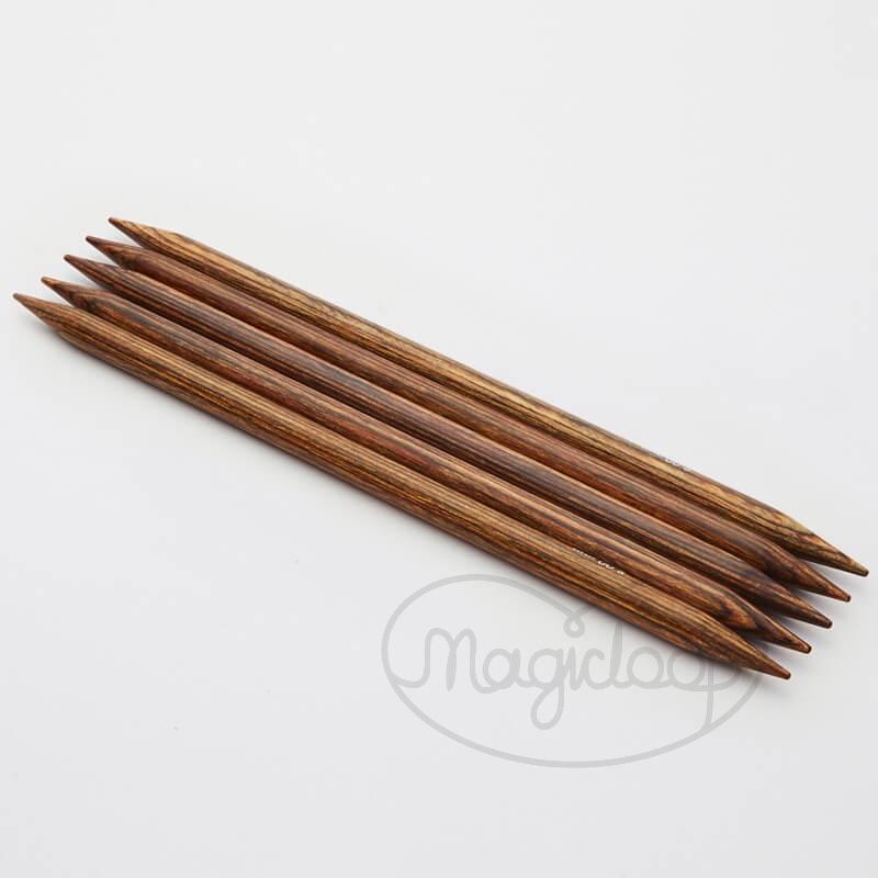 Druty drewniane KnitPro Ginger, skarpetkowe o długości 15 cm, wykonane z laminowanego, polerowanego drewna brzozowego o ciepłej brązowej barwie.