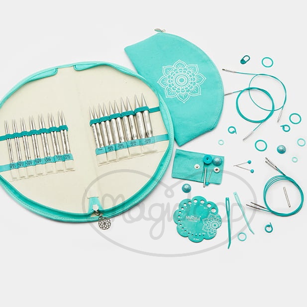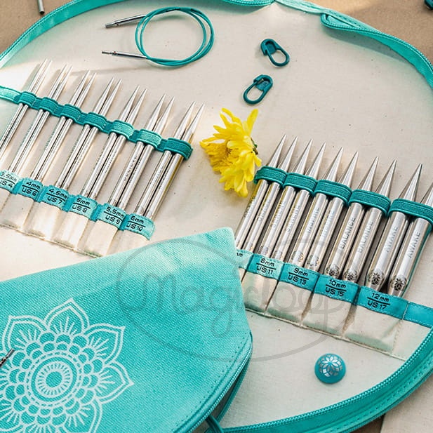 Etui wyposażone jest w przegródki dla każdej pary drutów, oznaczone ich rozmiarem. Torebka na akcesoria mieści się w środku. Wszystko jest bardzo praktyczne i sprzyja porządkowi oraz dobrej organizacji.